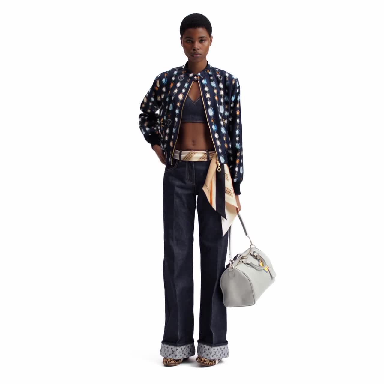 Jaket bomber model reversibel ini terlihat elegan dalam bahan silk twill. Salah satu sisinya berhiaskan corak berbentuk kalung khas musim ini, sementara sisi sebaliknya menampilkan motif Monogram bernuansa senada dengan finishing mengilap. Desainnya semakin memikat disertai hardware berwarna keemasan pada placket di bagian depan dan saku, sementara hem dengan aksen ribbing menyajikan kesan sporty.