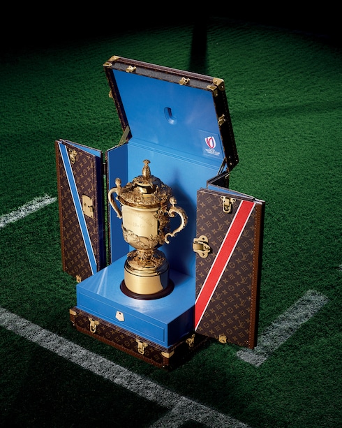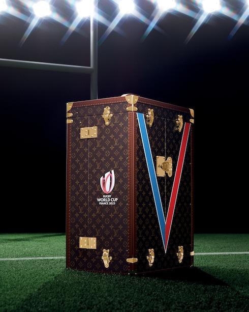 2015年に初のパートナーシップを締結したルイ・ヴィトンは、再び「ラグビーワールドカップ フランス 2023」において、「ウェブ・エリス・カップ」を収める公式のトロフィー・ケースを製作。ルイ・ヴィトンとラグビーワールドカップの長きにわたるパートナーシップに新たな章を刻む、ハンドメイドのトランクは、アイコニックなモノグラム・キャンバスに大会のイメージカラーを想わせるペイントや、「ラグビー・ユニオン」の1チームのプレイヤー数を表すローマ数字「XV」が描かれています。メゾンのトロフィー・トランクでは初めて、外装に描かれた「V」のディテールと同じ鮮やかなパントンブルーのラグジュアリーなレザーのライニングを採用しています。