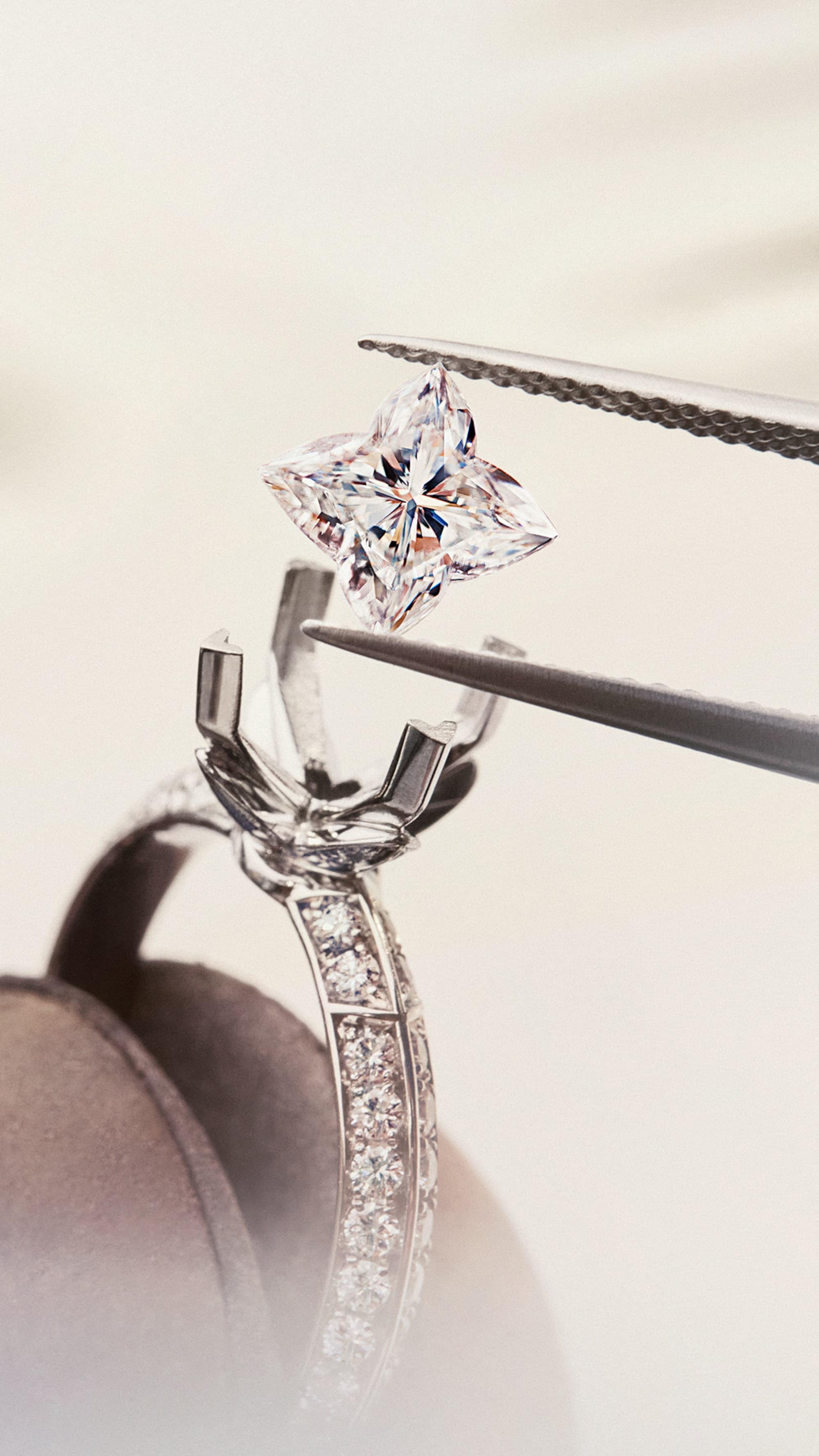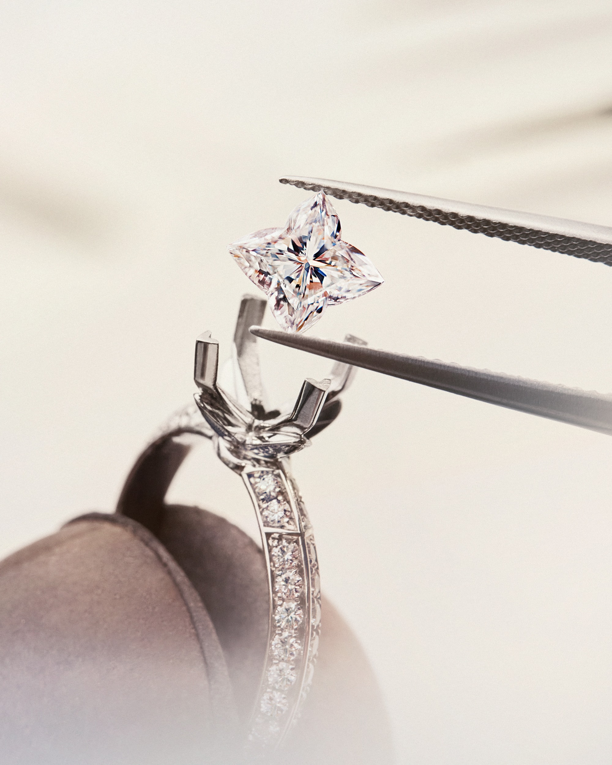 センターストーンは職人の手作業によって1つ1つ丁寧にマウントされます。V字型のプロング(爪)やフラワー型のベゼルなど、洗練と高度な技術を秘めたセッティングを施すことで、LV ダイヤモンドに命を吹き込んでいます。