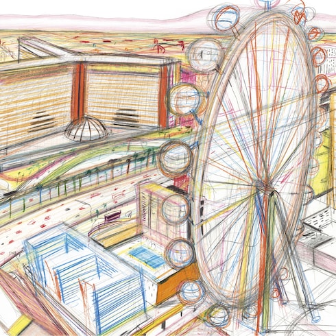 ヤン・ケビが初めてラスベガスを訪れたのは2012年──サンフランシスコからニューヨークまで「絵を描く旅」をした時に遡ります。そして2022年4月に、この街で自らの力を試すべく1週間にわたって再訪。明確な目的もなくストリップ通りを流れ行く人々の群れに一瞬にして引き込まれました。ラスベガスは、永遠に続く動きの中で両極端がぶつかるように、「役者が真ん中にいて、観客がその周りをウロウロしている円形劇場のようなものだ」と、アーティストは語ります。ケビがパリのスタジオに戻ってから、鉛筆が紙を擦り、溝を作り、彫刻していくという制作作業がはじまりました。