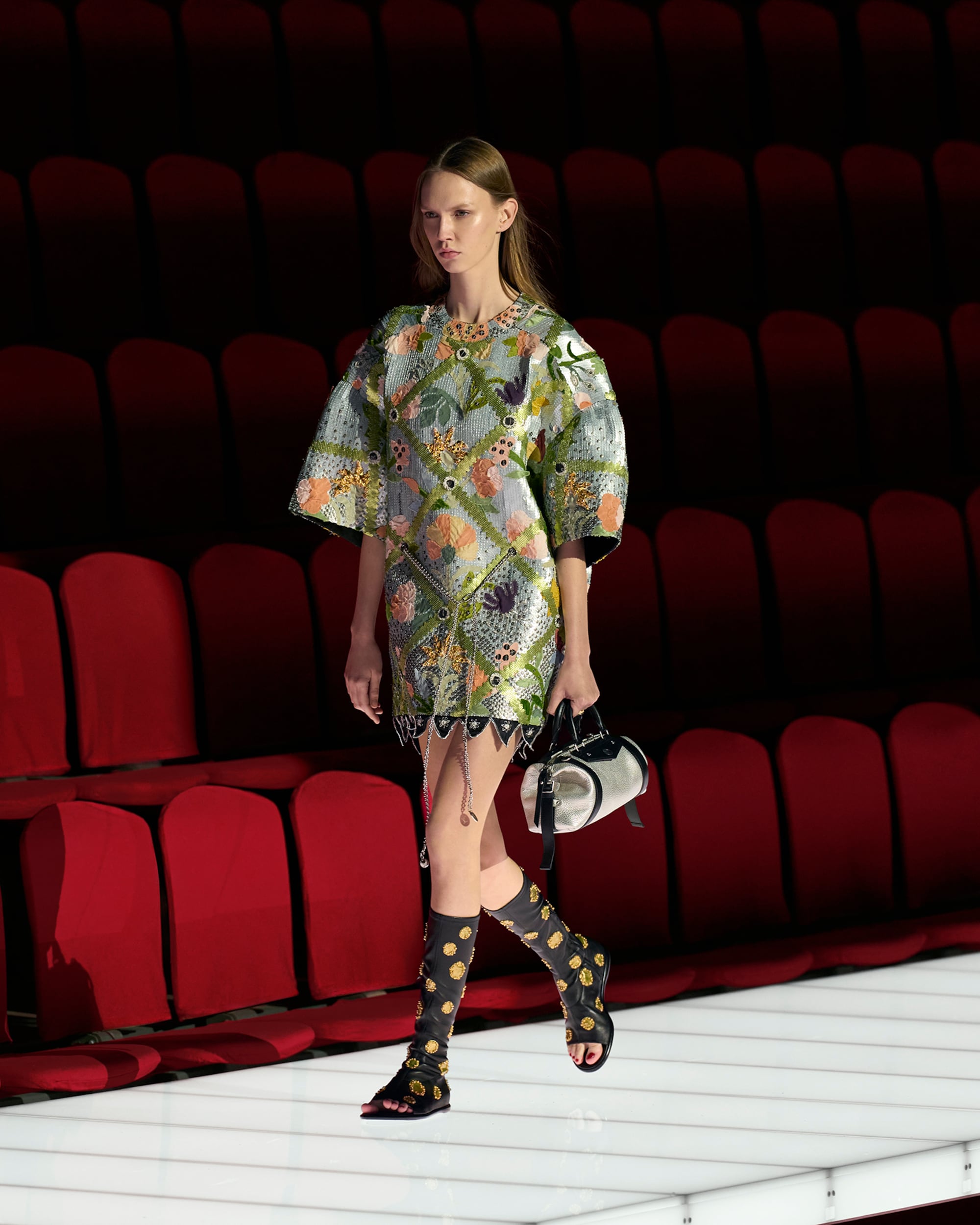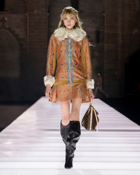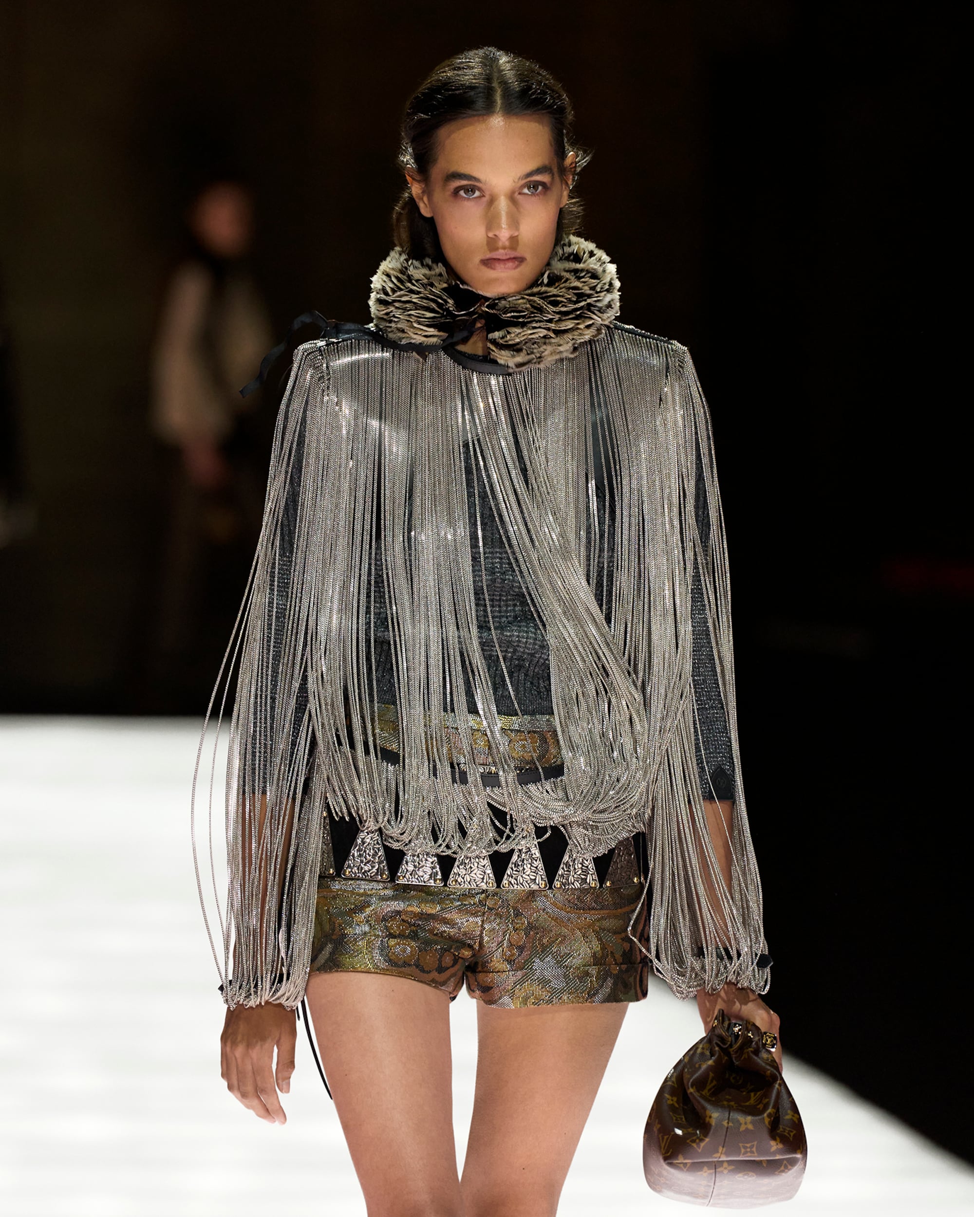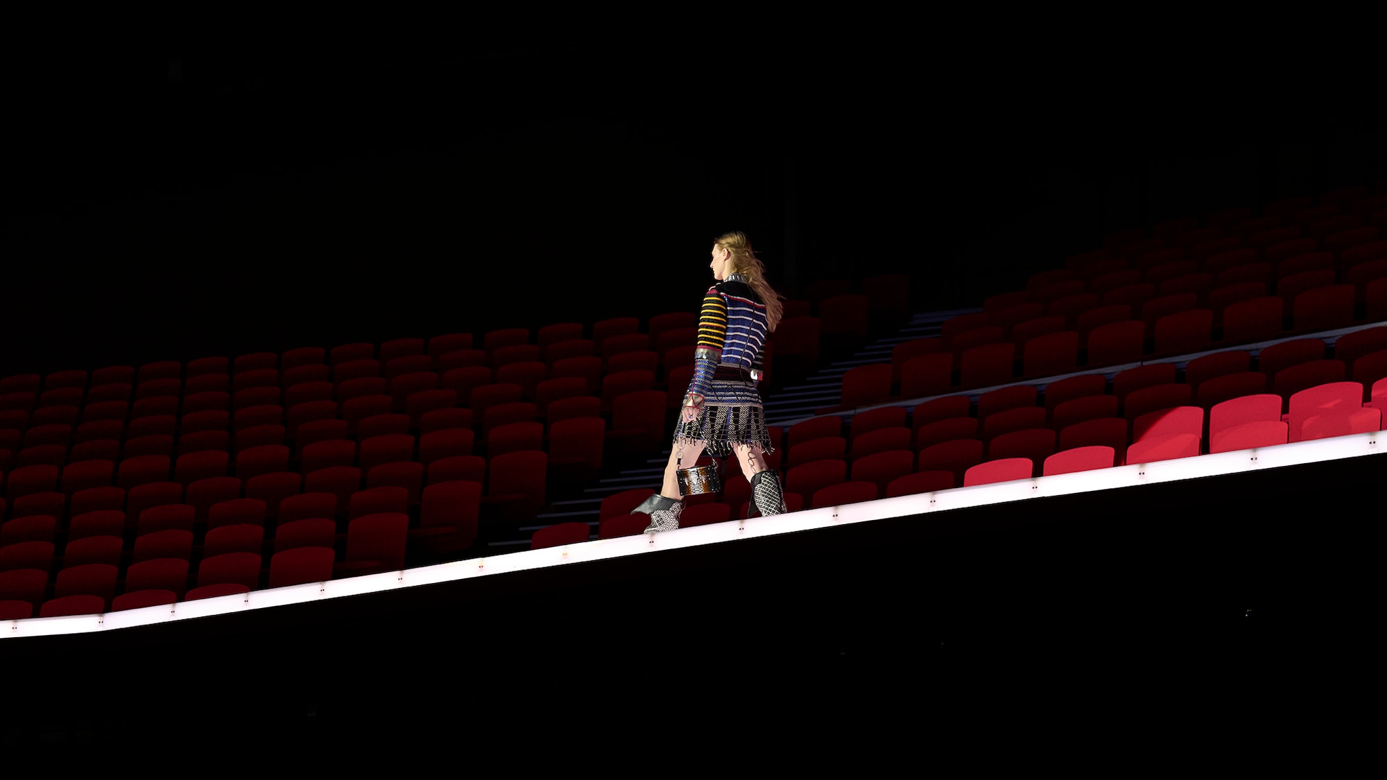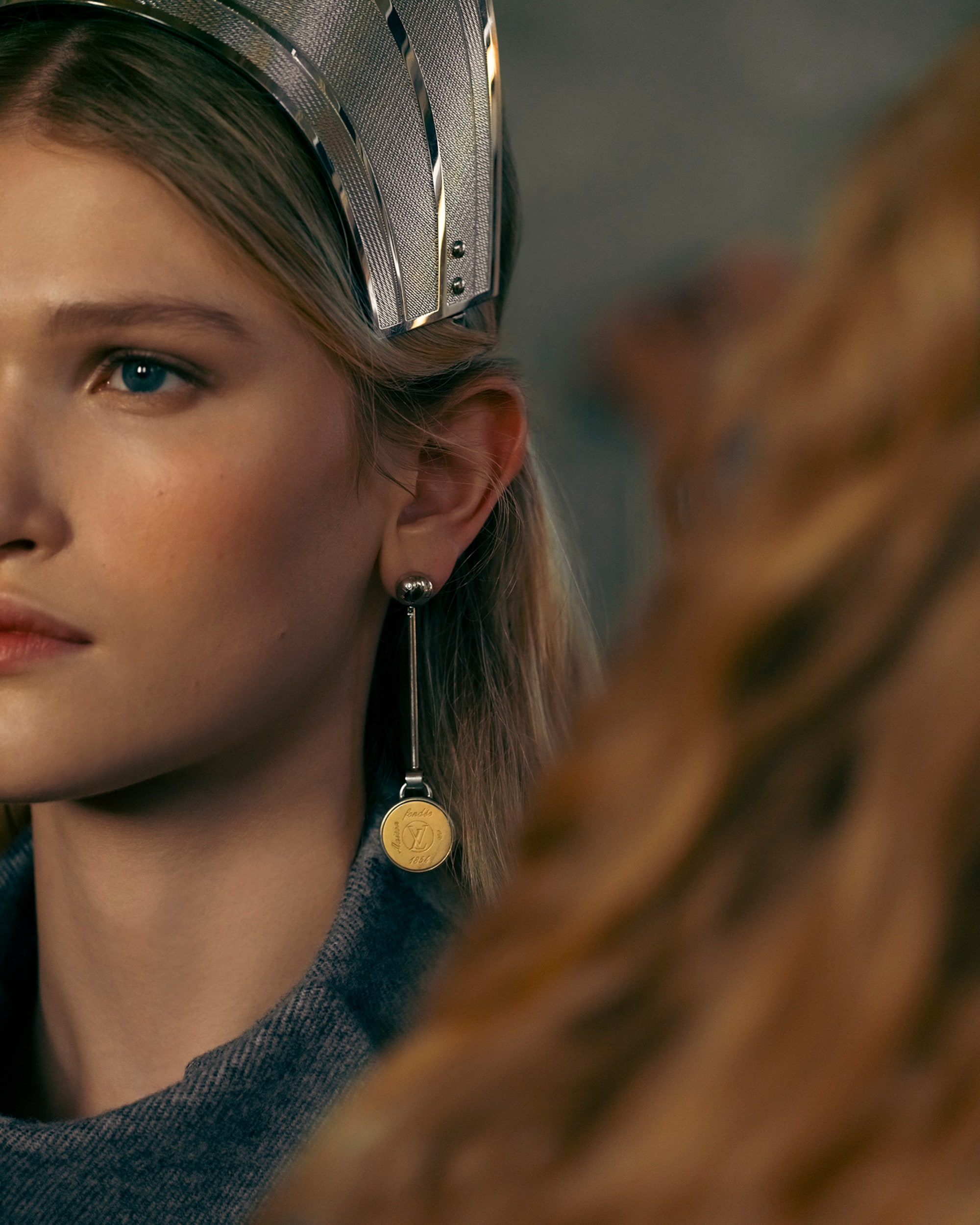 舞台芸術にオマージュを捧げた本コレクションで、ニコラ・ジェスキエールは中世の壮麗さとグラムロックの華やかさが交錯するドラマティックな時代の衝突を表現。先駆的なルイ・ヴィトン ウーマンの魅力を鮮やかに描き出しています。