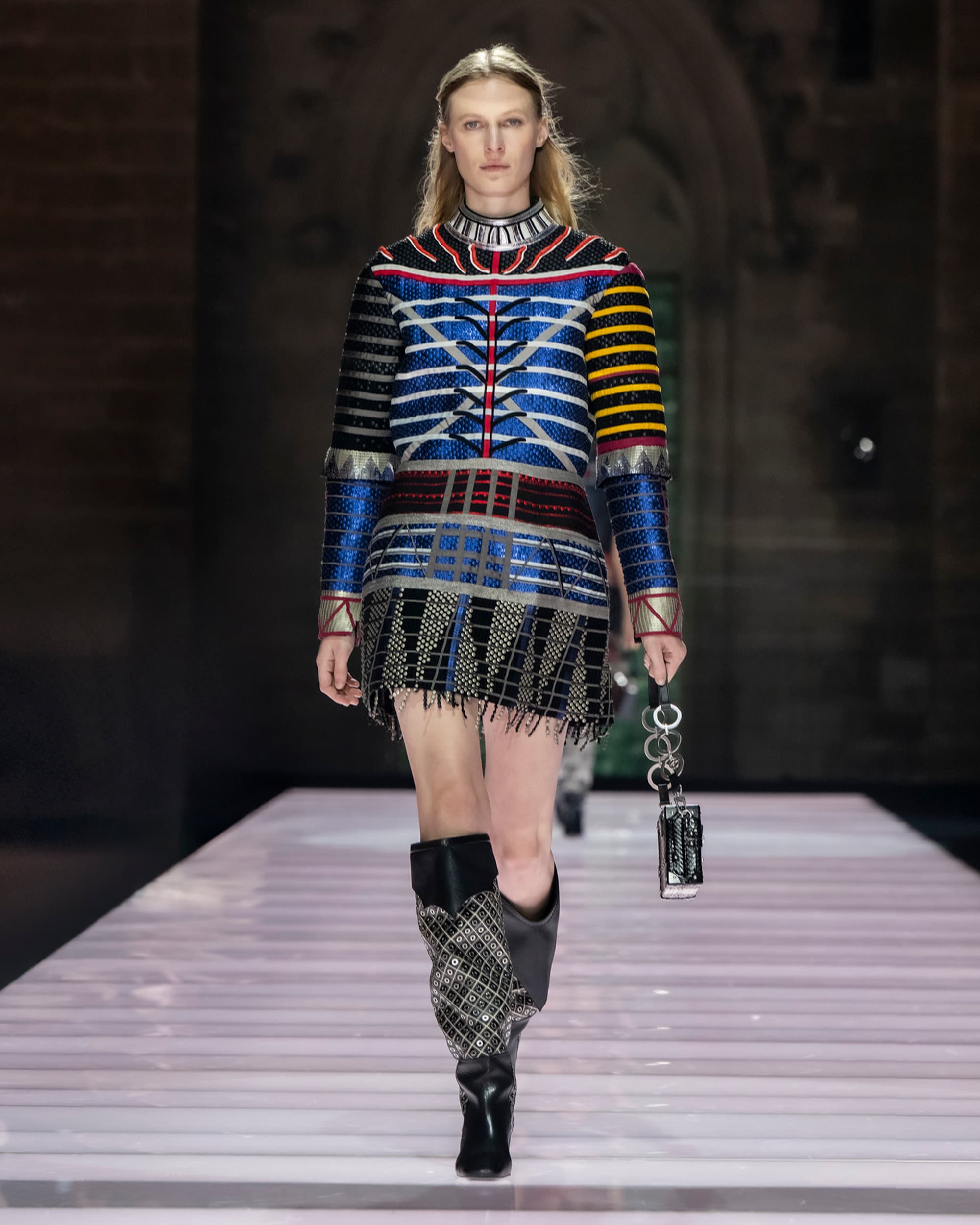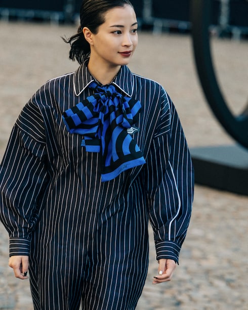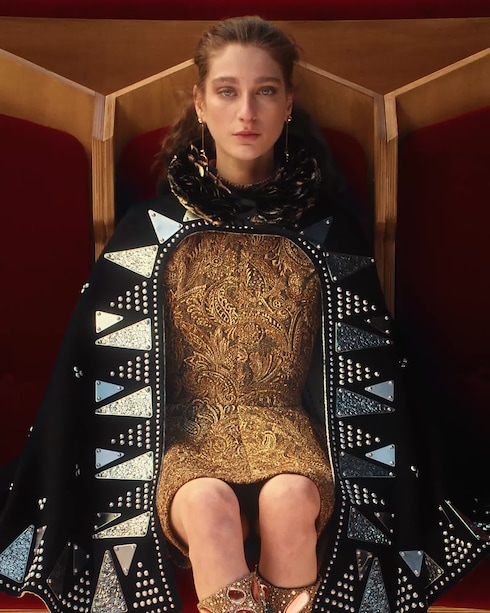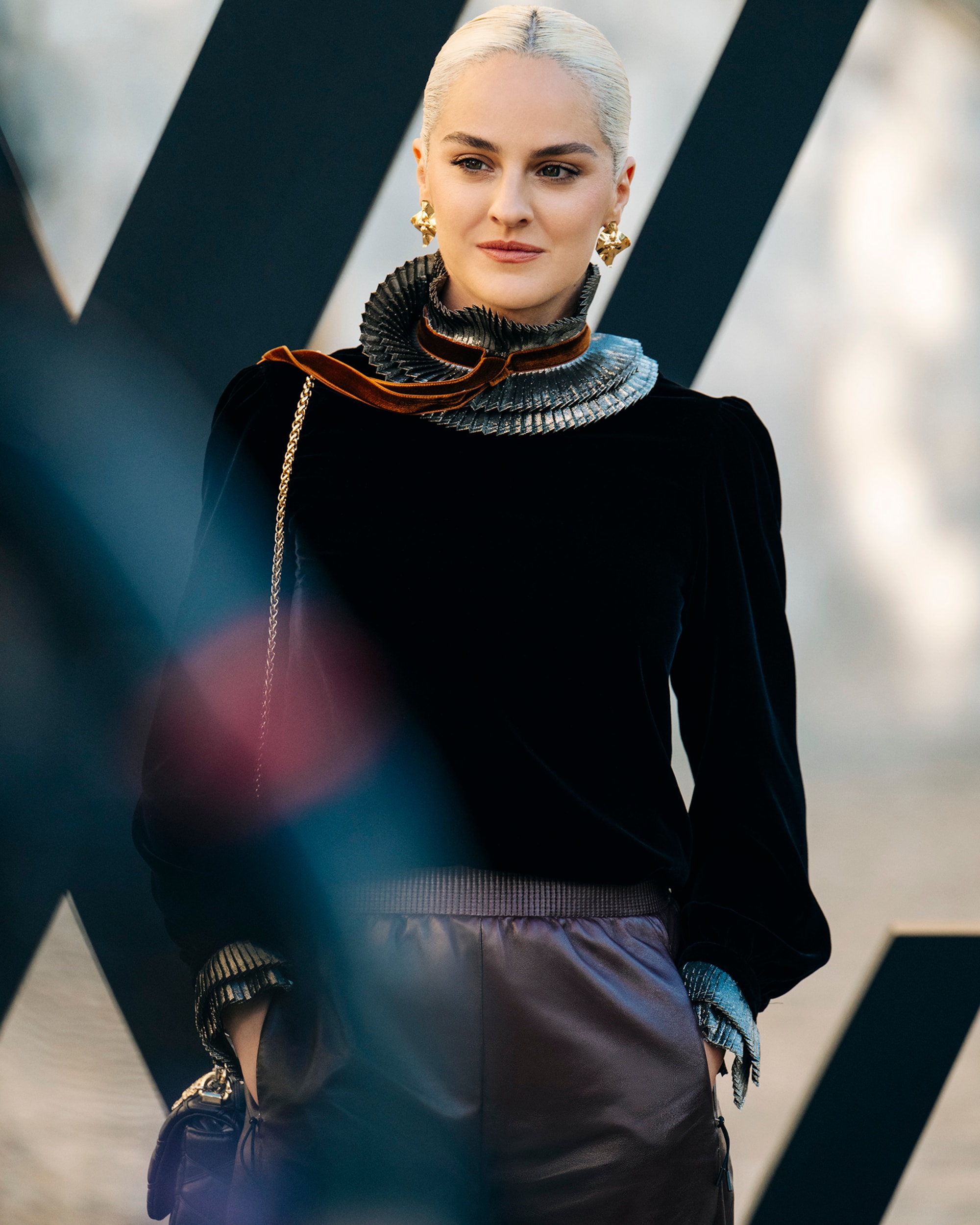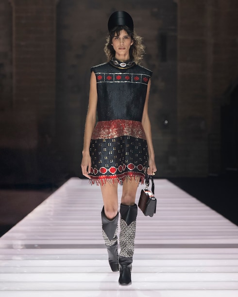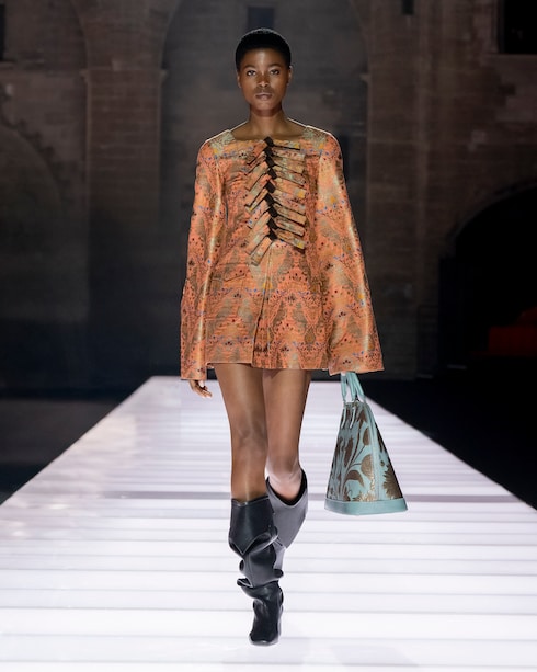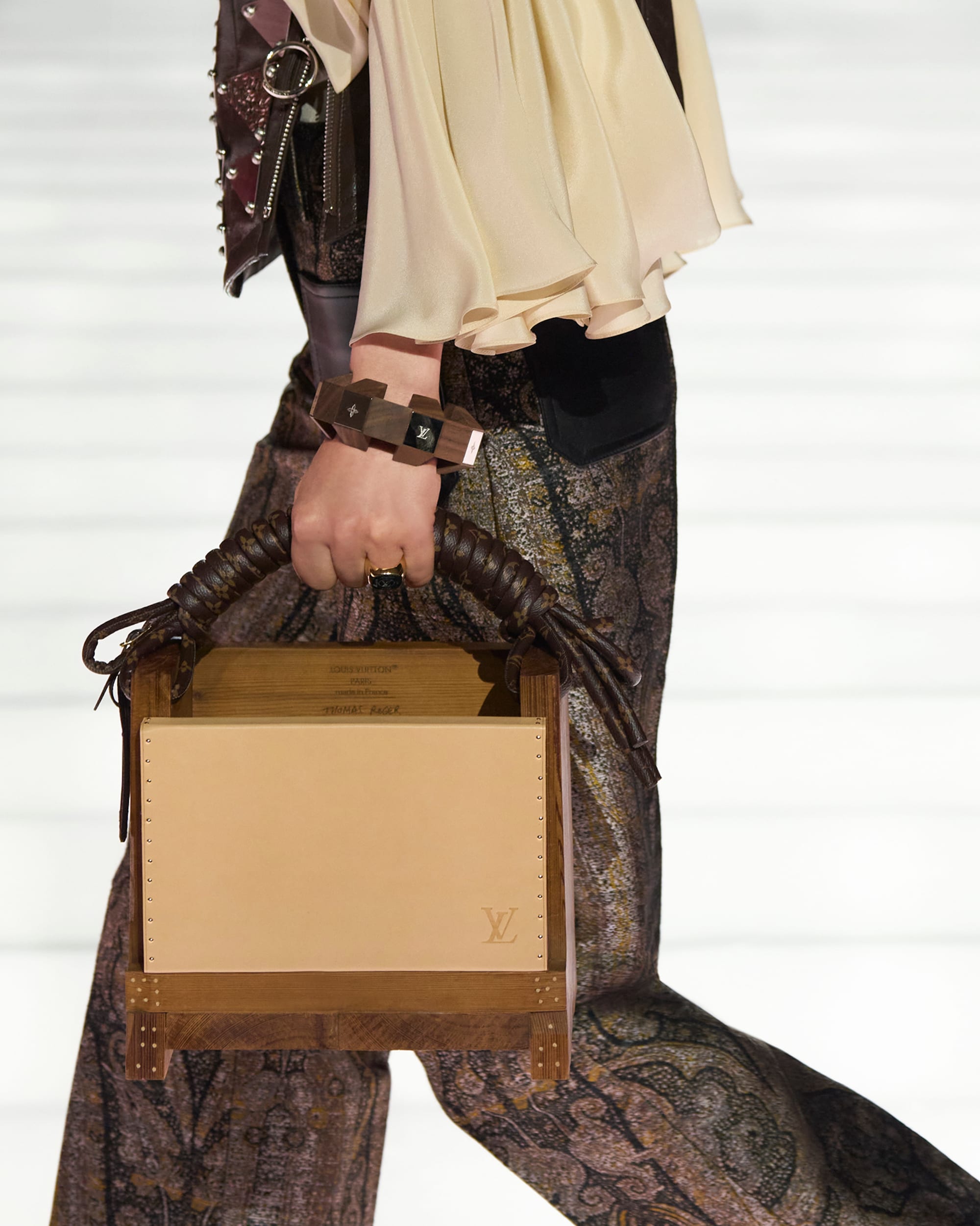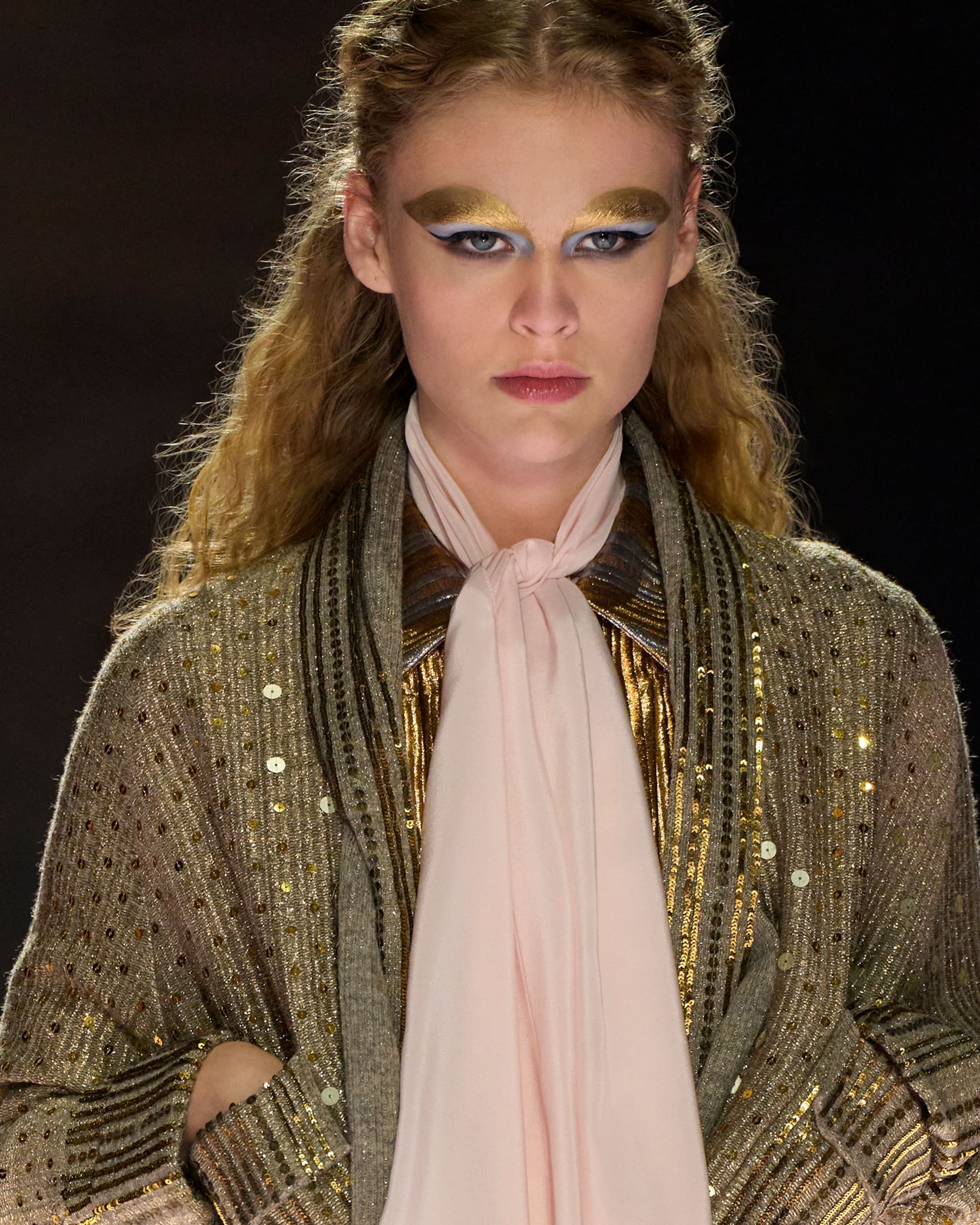 舞台芸術にオマージュを捧げた本コレクションで、ニコラ・ジェスキエールは中世の壮麗さとグラムロックの華やかさが交錯するドラマティックな時代の衝突を表現。先駆的なルイ・ヴィトン ウーマンの魅力を鮮やかに描き出しています。