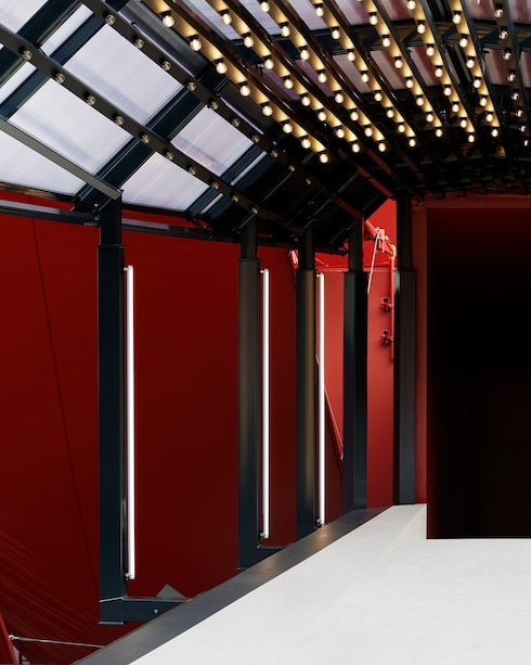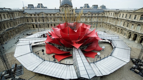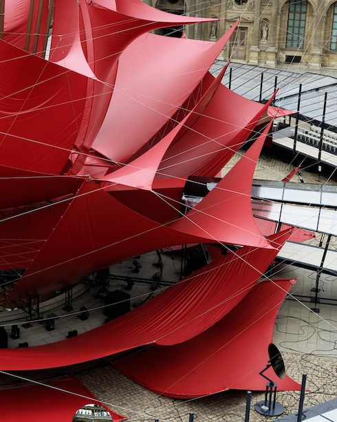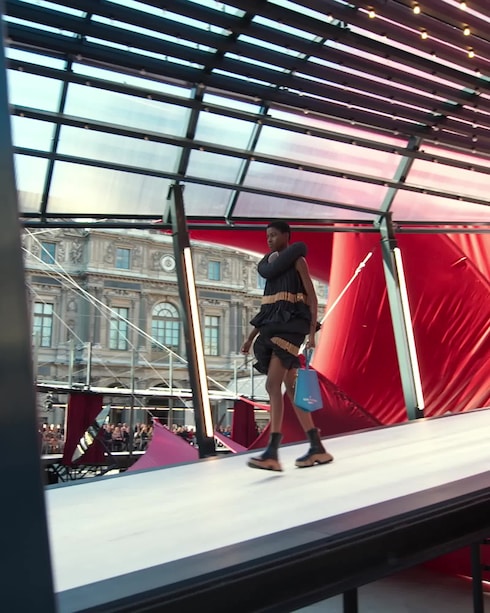 パリ、ルーヴル美術館の荘厳な雰囲気の中、同館の中庭クール・カレにて披露されたルイ・ヴィトンの2023春夏ウィメンズ・コレクション──今回初の試みとして、ニコラ・ジェスキエールはフランスを代表する現代アーティスト フィリップ・パレーノとプロダクション・デザイナーのジェームズ・チンランドを招き、壮大な舞台セットデザインを構想。メタルグリル、鏡、無数の電球などを用いた移動遊園地のアトラクションを彷彿させるそのセットは、パリの空に向かってドラマティックに立ち上がる黄金のおしべを持つ鮮やかな赤い「モンスターフラワー」が中心に据えられています。
