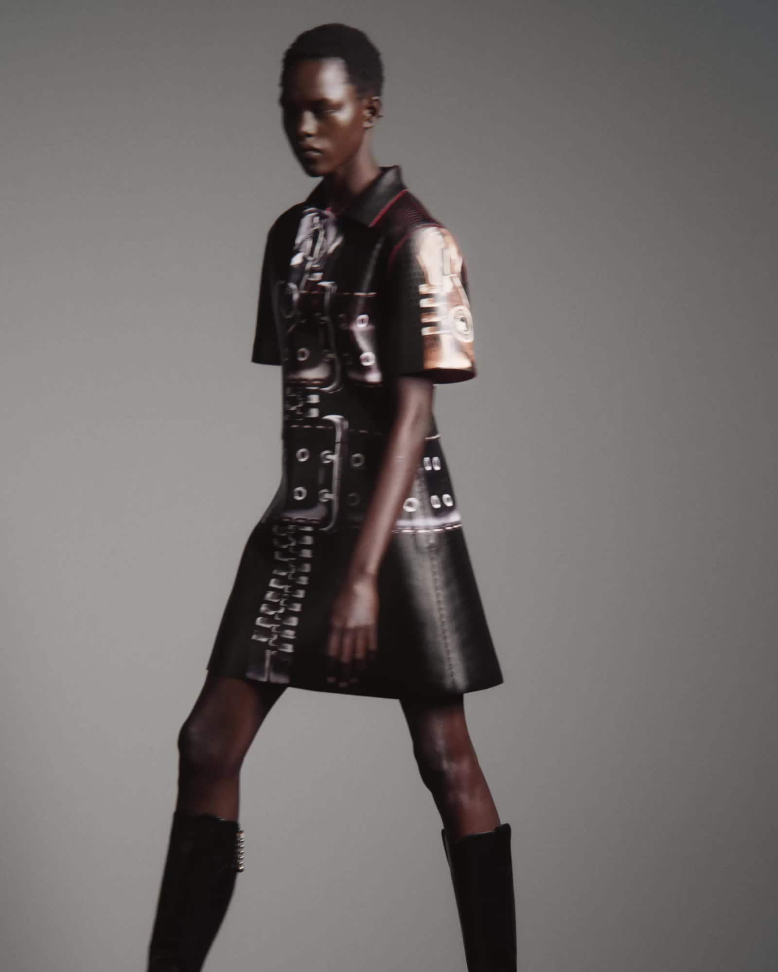 女性のワードローブを構成する要素に着目し、比率とスケールを再解釈して創り出された、ディテールが際立つシルエット──3Dプリントされたベルトはトロンプ・ルイユ(騙し絵風)の効果をもたらし、拡大されたキルトのひだはフラットなプリーツドレスとなり、遊び心とユニークな一面を加えています。また、ニコラ・ジェスキエールは素材を超拡大し、3Dスキャナーを用いて、1本1本の糸やその質感を際立たせたマクロツイードを模した刺繍をあしらいました。強調することでスタイルを体現するバッグは、不均衡なディテールや、ドラマティックな比率で再解釈されています。