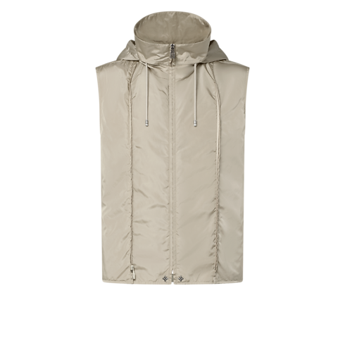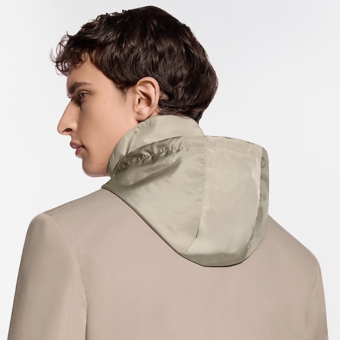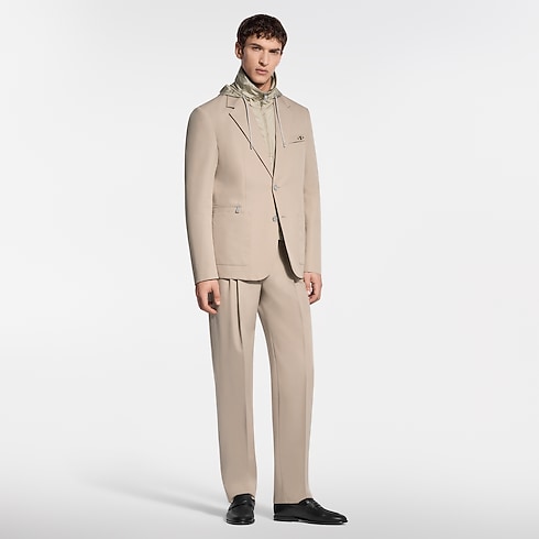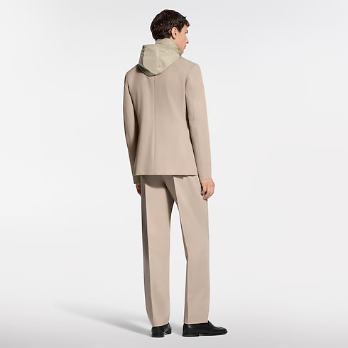 撥水加工を施したウール&コットンツイルで仕立てた3 in 1シングルブレストのジャケット。取外し可能なテクニカルジレとパッカブルフードを備えています。いずれもファスナー式の、メタルのLV オーナメントがあしらわれた胸ポケットとチケットポケットが実用的な印象をプラス。タイムレスなベージュで仕上げた1着は、同シリーズのパンツと合わせればモダンなビジネスルックに。