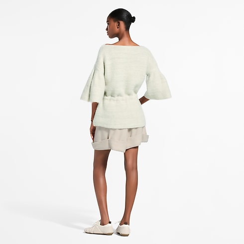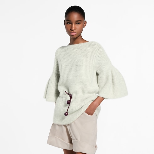 ショーコレクションの建築的なインスピレーションを彷彿させる、エレガントなボートネックのニットトップ。ステートメントを放つ肘までのベルスリーブが彫刻的なシルエットを描き、LV キューブをあしらったレザーのコードベルトがウエストを美しく引き締めます。シルクやアルパカ、モヘヤを混紡した軽量素材を編み上げ、暖かさと快適さを一層引き立てました。