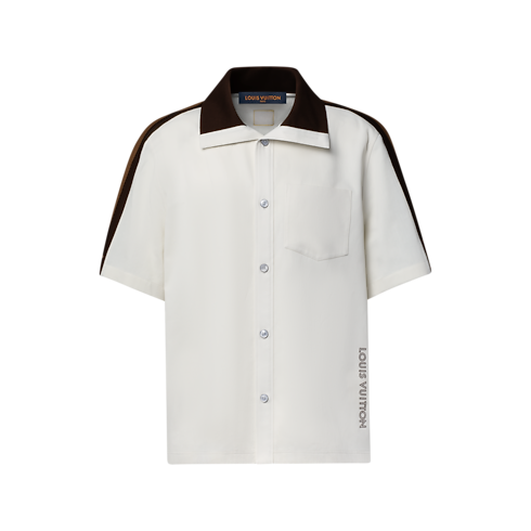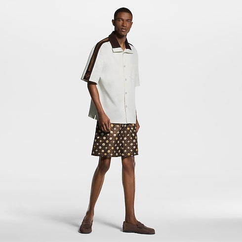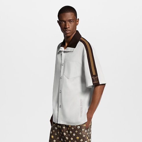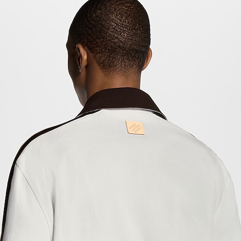ダークブラウンのリブ編みインサートがグラフィカルなアクセントを添える、ショートスリーブのホワイトコットンピケシャツ。シグネチャーを刺繍したバンドが肩部分と袖を彩り、ブラウンの襟はボタンを留めてタートルネックのようにも、開けたままでも着こなせるデザイン。左身頃の刺繍で施した「Louis Vuitton」シグネチャーがスポーティな印象を加えます。本コレクションの流れるようなパンツやショートパンツとミックス&マッチすれば、プレッピーなルックが完成します。
