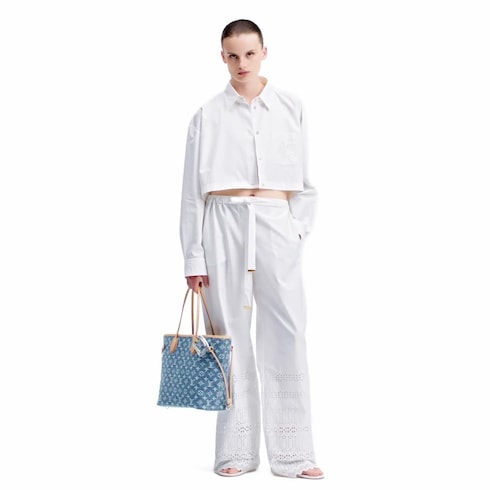 今シーズンならではのディテールがロマンティックで夏らしい雰囲気を引き立てるシャツ。軽やかなコットンポプリンを使用したクラシックなテーラリングのコードを備えたアイテムに、スマートな襟とファスニング付きの袖口を配し、クロップドシェイプでモダンなひねりを加えています。パッチポケットには精緻なアングレーズ刺繍でLV イニシャルをさりげなくあしらい、上品なマザー・オブ・パール風のボタンがルックを完成させます。