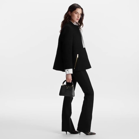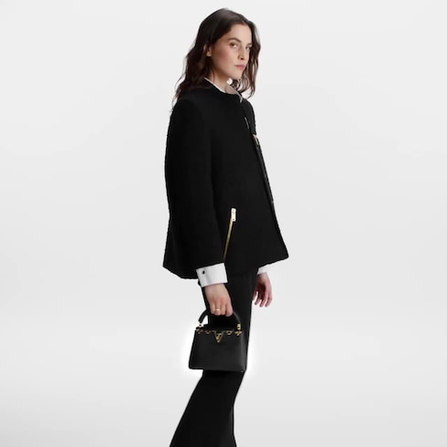 漆黒に染め上げたトリヨンレザーで仕立てた「カプシーヌ MINI」。ボディのトップにはゴールドカラーのモノグラム・フラワーをまるで「花冠」のようにレザーに手作業であしらいました。愛らしいサイズと繊細な花々の装飾がフェミニニティを演出し、取外し可能でファッショナブルな幅広ストラップとレザーのトップハンドルでさまざまな持ち方をお楽しみいただけます。