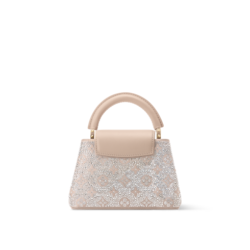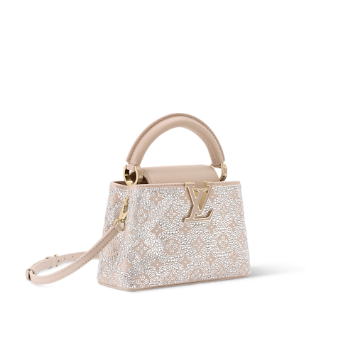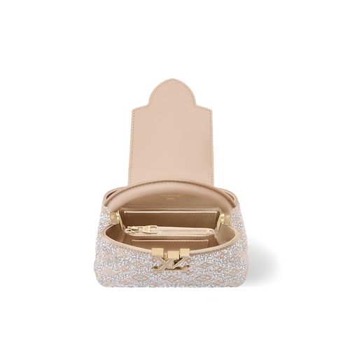 洗練されたきらめくデザインがイブニングパーティにふさわしい「カプシーヌ MINI」。「LV ミラージュ」コレクションの一部として登場したアイテムで、サテン素材に光を受けて輝くスワロフスキー™のストラスがあしらわれています。デザートサンドの色合いが、エレガントなゴールドカラーの金具で縁取った同系色のLV イニシャルと見事に調和。手持ちや斜め掛け、肩掛けでも楽しめます。