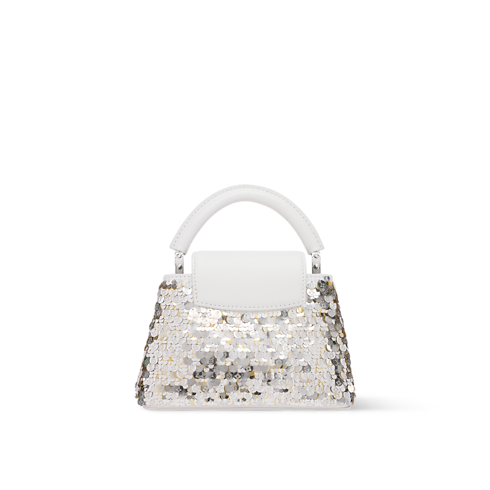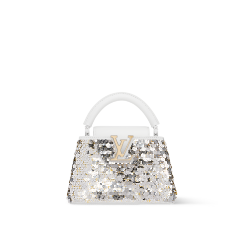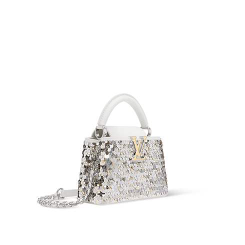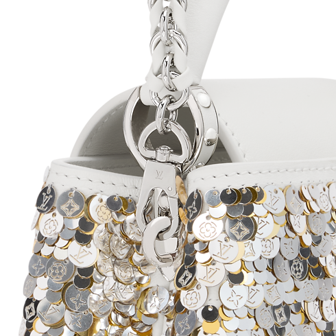 「エクセプショナル」コレクションとして、エレガントなスノーの色合いで再解釈された「カプシーヌ MINI」。きらめくスパンコールが刺繍されたレザーを使用し、編み上げチェーンと調和するゴールド&シルバーカラーのLV イニシャルがあしらわれています。フラットポケット付きの内装は、お気に入りのリップスティックなどの毎日の必需品を充分に収納できるスペースを備えています。