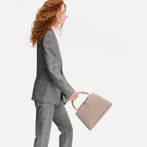 2013年に発表された「カプシーヌ MM」は、ルイ・ヴィトンが1854年に初の店舗を構えたパリのカプシーヌ通りにちなんで名付けられました。フルグレインのトリヨンレザーで美しく仕立てたハンドバッグは、フラップ部分を外に出せばモノグラム・フラワーが、中に入れるとレザーでコーティングしたLV イニシャルが見える特徴的なデザインが魅力。ラグジュアリーなパイソンレザーを使用したトップハンドルが洗練された雰囲気を添えます。