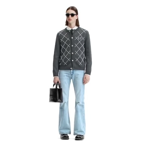「責任ある調達」によるメリノウールを使用した、ダークグレーのカーディガン。今シーズンのテーマである、英国の由緒あるカントリーハウスでの華やかなファミリーリユニオンをイメージしてデザインされました。前面には、パールホワイトのビーズ刺繍でダミエ・アーガイル パターンと胸元のLV イニシャルを表現。スマートなコットンシャツと合わせれば、シックながらもリラックス感の漂うイブニングスタイルが完成します。