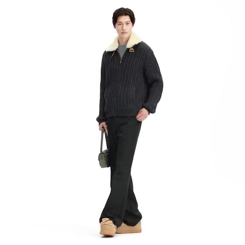 ダークグレーのジップアップブルゾン。贅沢なカシミヤ&ウールのヤーンで仕立てた、オープンテクスチャーのボリューム感のあるリブニットが魅力です。温かみのあるシアリングの襟は、バックル付きのヌメ革の色合いのレザーストラップで留められる仕様で、同レザーを使用した「Marque L. Vuitton Déposée」のパッチがアクセントを添えます。洗練された雰囲気とリラックス感を兼ね備えた、冬の季節に最適な一着。