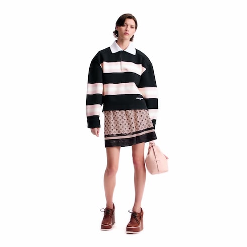 定番のデザインをさりげなくアップデートしたポロトップ。コットンインターロックジャージーを使用し、ボクシーなオーバーサイズフィットに仕立てられています。太めの横縞ストライプがグラフィカルでスポーティなスタイルを彷彿させ、ネックラインにはコントラストを効かせたリブ編みの襟をあしらい、比翼仕立てのボタン開閉に仕上げました。「LOUIS VUITTON」のスカーフタグがルックに大胆なシグネチャーをプラス。