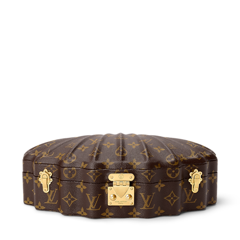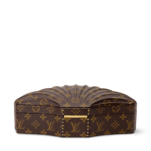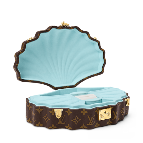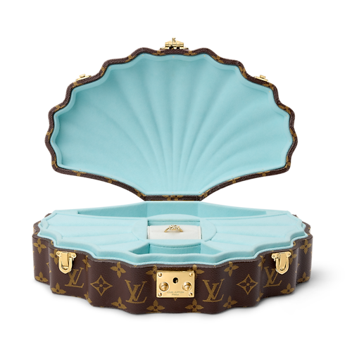 ハードトランク・コレクションの隠れた名品「コフレ・コキヤージュ」。貝殻のようなフォルムは、フランス王妃 アンヌ・ドートリッシュがルーヴル宮殿に構えた居室から着想を得ています。モノグラム・キャンバスを使用したトランク中央にはウォッチやブレスレットを収めるクッションやリング収納用のスロットを配し、両サイドにはリングやイヤリング用のクッションを備えています。3Dプリンターによって作られたスカラップ状の内装には、ラグーンブルーのマイクロファイバーライニングが施されています。