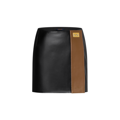 ラムレザーをミニマルなストレートシェイプに仕立てた、上品でスタイリッシュなミニスカート。レザーパネルを組み合わせたカラーブロックが、ラップフロントにグラフィカルなコントラストを加えます。メゾンのレザーグッズ・コレクションを想わせるゴールドカラーのスイングロックが、装いにエンブレマティックな華やぎをプラス。背面は隠しファスナーで開閉します。