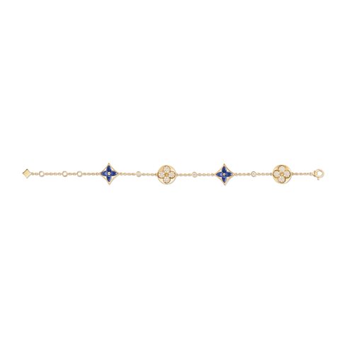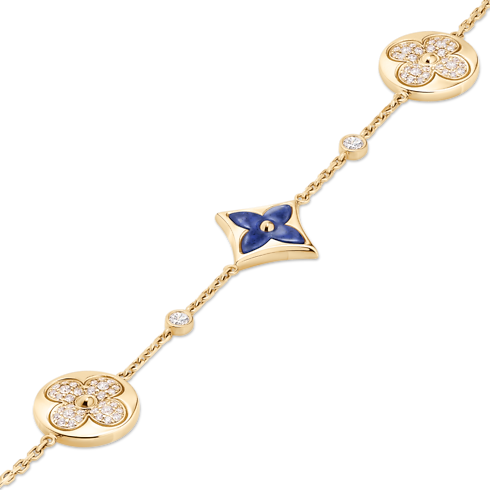 創業者の息子 ジョルジュ・ヴィトンが1896年に手掛けたエンブレマティックなモノグラム・フラワーを讃える「カラー ブロッサム」コレクションから登場した、「ブレスレット カラー ブロッサム BB」。イエローゴールド(18K)にソーダライトで象った星と太陽のモチーフを手作業で艶やかに磨き上げ、ラウンドブリリアントカットのダイヤモンドを添えたプレシャスなブレスレット。数ヶ月もの時間をかけ、貴石の絶妙な曲線と完璧な輝きを引き出しています。繊細なデザインで、本コレクションの他のモデルと重ね付けやミックス&マッチを楽しめます。