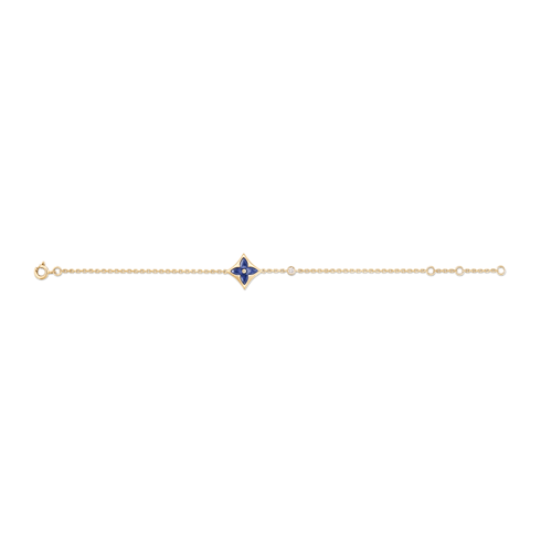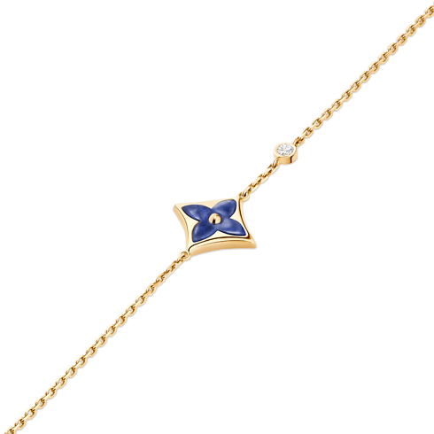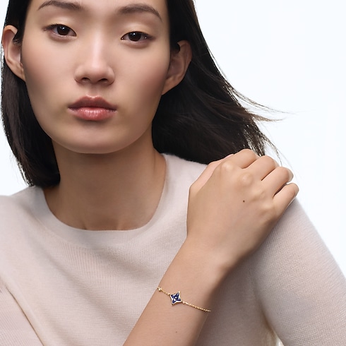 創業者の息子 ジョルジュ・ヴィトンが1896年に手掛けたエンブレマティックなモノグラム・フラワーを讃える「カラー ブロッサム」コレクションから登場した、「ブレスレット カラー ブロッサム BB」。イエローゴールド(18K)にソーダライトで象った星のモチーフを手作業で艶やかに磨き上げ、チェーンにラウンドブリリアントカットのダイヤモンドを添えたプレシャスなブレスレット。数ヶ月もの時間をかけて、貴石の絶妙な曲線と完璧な輝きを引き出しています。繊細なデザインで、本コレクションの他のモデルと重ね付けやミックス&マッチを楽しめます。