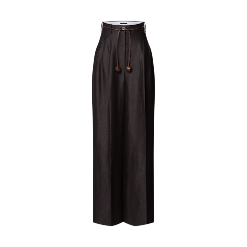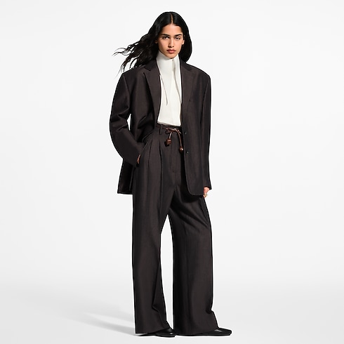 テーラリングにリラックスしたアプローチを取入れたパンツ。今シーズンにふさわしい深みのある色合いに仕上げた、軽やかなウール&リネンの混紡素材を使用しました。エレガントなワイドレッグシェイプに施した張りのあるクリースが、両脚の美しい構造をさりげなく引き立てます。ハイライズのウエストバンドには、今シーズンのスリムなレザーコードベルトと「LOUIS VUITTON PARIS」パッチをあしらいました。