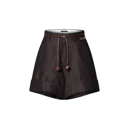 洗練されたリラックス感をまとうテーラードショートパンツ。深みのある色合いのウール&リネンの混紡素材を使用しています。はき心地のよいハイライズのストレートシェイプに、ボリューム感のあるオーバーサイズの裾を配してシルエットを際立たせました。遊び心溢れるLV キューブをあしらったスリムなレザーコードベルトがカジュアルな印象を引き立て、今シーズンのシックな「LOUIS VUITTON PARIS」パッチがヒップにさりげないシグネチャーを添えます。