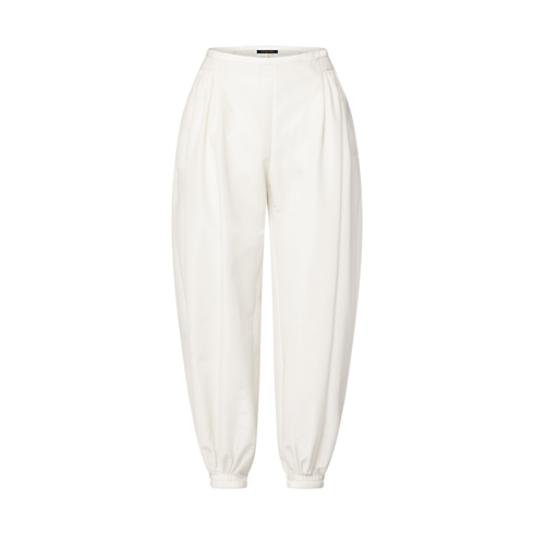 パジャマのカジュアルな快適さから着想を得た、ショーコレクションのパンツ。軽やかなコットンポプリンで仕立てたボリューム感のあるバルーンシェイプに、腰と足首に施されたプリーツのディテールがアクセントを加えます。ウエストバンドはサイドのボタンで留めることができ、同系色で仕上げたLV サークルのレザータブがさりげないシグネチャーをプラス。