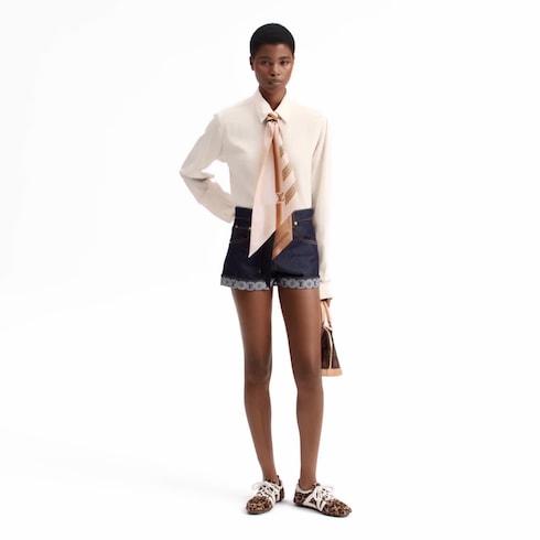 すっきりとしたストレートシェイプに仕立てたミニ丈のショートパンツ。今シーズンに欠かせないダークウォッシュデニムが毎日のスタイリングを昇華させます。コントラストを効かせたイエローのトップステッチが構造を引き立て、タイムレスなルックを演出。折り返した裾からは内側にプリントされたアイコニックなモノグラム・モチーフが覗きます。