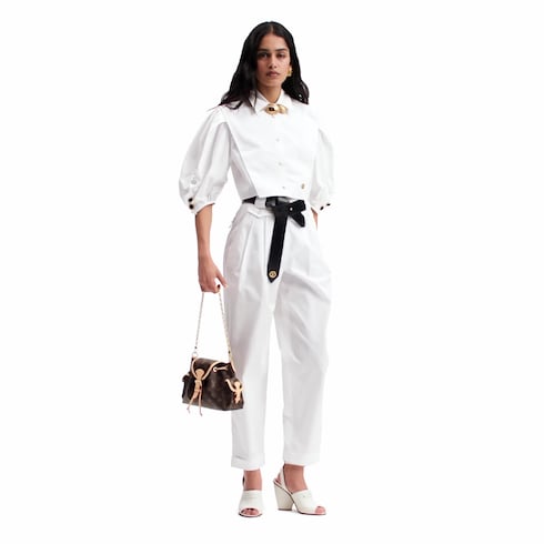 張りのあるコットンポプリンを使用した、夏らしいフレッシュな印象のワイドレッグパンツ。腰部分のクリースでボリューム感を強調しました。幅広のハイウエストバンドがボディラインを美しく引き立て、2つのミニフラップ付きポケットが構築的なタッチを添えます。今シーズンならではのエレガントなゴールドカラーで縁取られた刺繍入りボタンが上品な雰囲気をプラス。