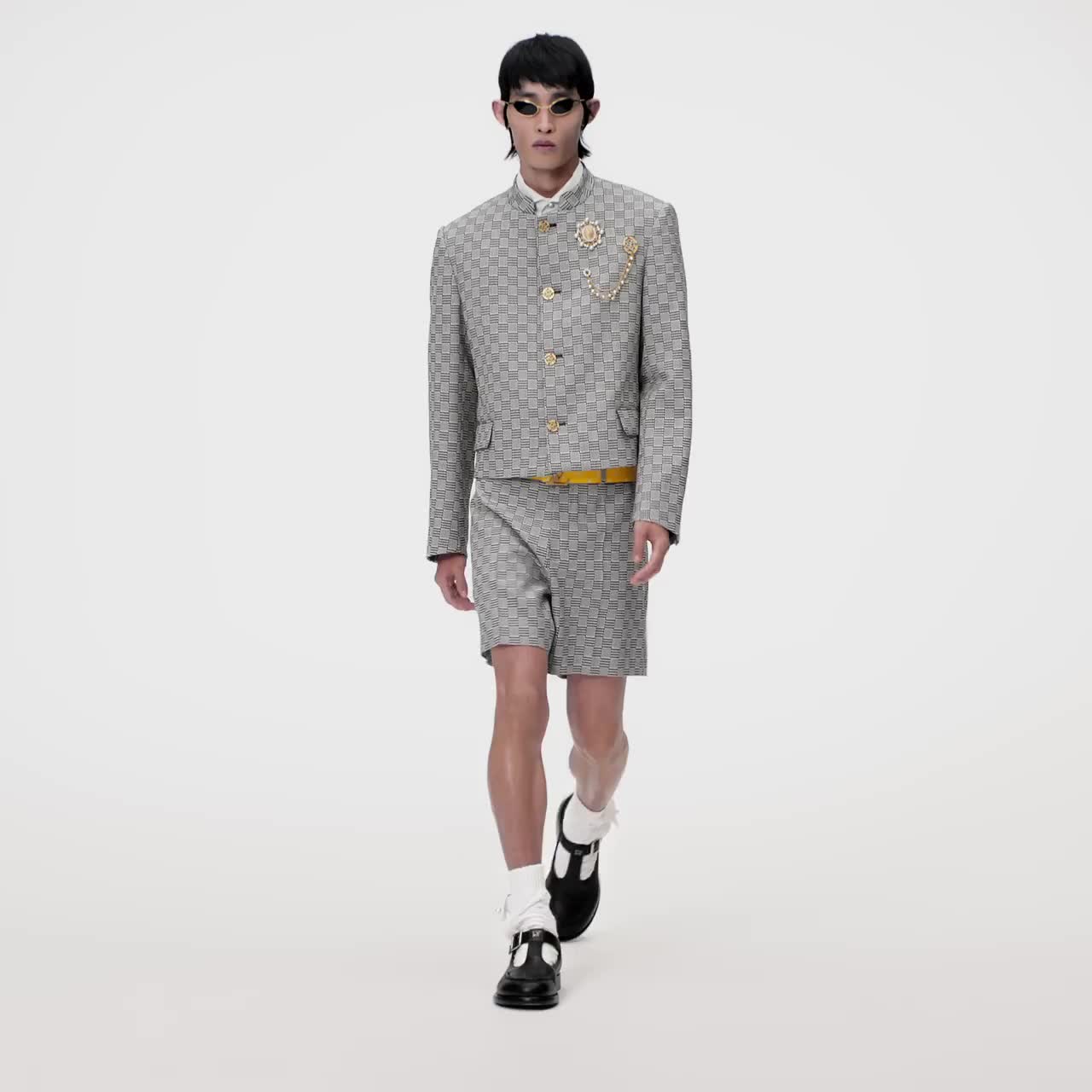 2024春夏ファッションショーのダンディなテーマから着想を得て、クロップド丈の個性的なシルエットとオフィサーカラー(立詰襟)で仕上げたテーラードジャケット。コレクションに登場したファレル・ウィリアムスのシグネチャーの1つである、ジュエリーのようなゴールドカラーのボタンが中央の開閉部とカフに彩りを添えます。エレガントなウールジャカードに千鳥格子をあしらい、マイクロ・ダミエ パターンを組み合わせました。同シリーズのショーツとコーディネートすれば、モダンなひねりを加えたスーツスタイルに。