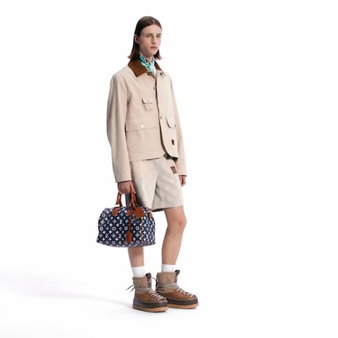 ダミエ・パターンを施したベージュのコットンピケで仕立てた、ハイブリッドなワークウェアスタイルのショートパンツ。両脚の外側に配されたスポーティなカラーブロックのナイロンインサートと、パッチポケットが特徴のアイテムです。柔らかなリブ編みのドローストリング付きウエストにはゴールドカラーのメタル製コードエンドをあしらい、左ポケットには今シーズンの日本人デザイナー NIGO®とのコラボレーションを讃える「LV Japan」のラベルを刺繍で施しました。揃いのプルオーバーを合わせれば、リラックス感がありながらも印象的なセットアップに。