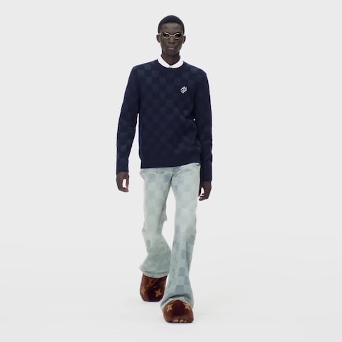 メゾンの伝統的なダミエ・パターンを質感のある同系色のニットで再表現した、ダークブルーのメリノウールを使用したプルオーバー。ジュエリーのようなレジンパールの刺繍が2024春夏ファッションショーに登場した新たな「Marque L. Vuitton Déposée」シグネチャーを彩ります。さりげないエレガンスが薫るタイムレスな1着は、多彩なルックを完成させます。