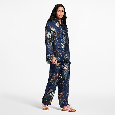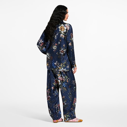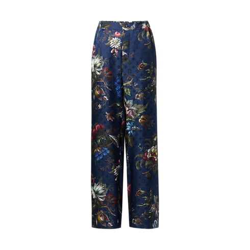 ショーコレクションのシックなステートメントアイテムである、大胆で軽やかなパジャマパンツ。なめらかなシルクツイルに光沢感のあるモノグラム・ジャカードを配し、深みのあるミッドナイトカラーのエレガントなフローラルプリントを重ねました。ゆったりとしたストレートシェイプにドローストリング付きのウエストバンドをあしらい、タイムレスでリラックスした装いに仕上げました。