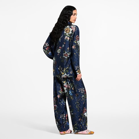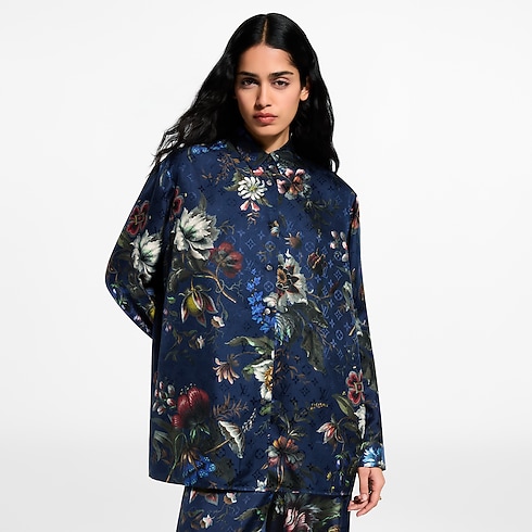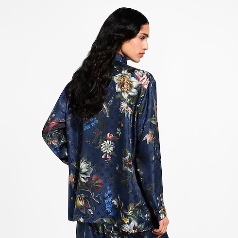 深みのあるミッドナイトカラーのフローラルプリントで再解釈した、今シーズンのエレガントなシルクシャツ。光沢感を放つモノグラム・ジャカードが、前面にさりげないシグネチャーを添えます。爽やかなストレートシルエットに、スマートな襟やカフスボタン付きの袖口、フロントボタン開閉をあしらい、定番のテーラードスタイルに仕上げました。