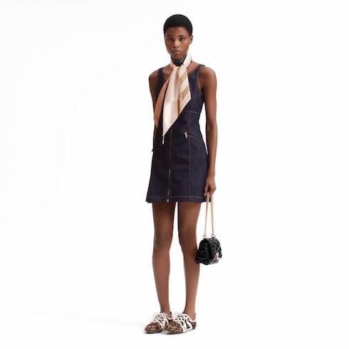 シックで普段使いにぴったりなミニドレス。ダークウォッシュデニムを使用し、フィット感のあるVネックラインのトップとAラインスカートでフェミニンなシルエットに仕立てました。モノグラム・キャンバスの引き手をあしらったフルレングスの務歯見せフロントファスナーを、斜めに配された腰のファスナー式ポケットが引き立てます。