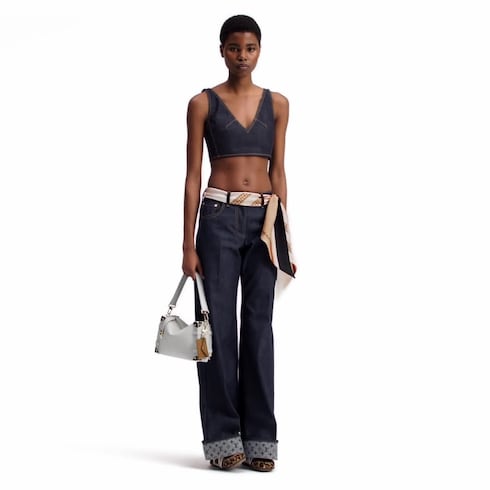 シックで構築的なクロップトップ。今シーズンに欠かせないダークウォッシュデニムにイエローのトップステッチでコントラストを効かせ、タイムレスなルックを演出しました。フィット感のあるシェイプに仕立て、前面と背面にはシャープなVネックラインを配しています。フリンジ付きのモノグラム・キャンバスの引き手がファスナー開閉部にコンテンポラリーなシグネチャータッチをプラス。