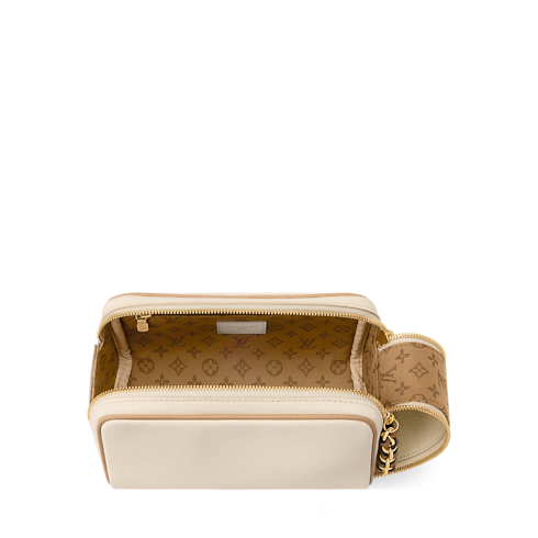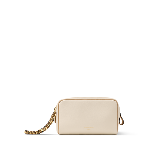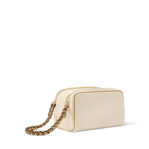 ウィメンズ アーティスティック・ディレクター ニコラ・ジェスキエールが、フェミニンなエレガンスを吹き込んだ「ミニ・ドップキット」。バニラカラーのカーフレザーを使用し、ゴールドの編み上げチェーンで仕上げました。 ダブルファスナー開閉式を採用した広い開口により、モノグラムのライニングを使用した内装とファスナー付きポケットにスムーズにアクセス可能。チェーンをハンドル代わりにシックなハンドバッグとしても楽しめる機能的なアイテム。