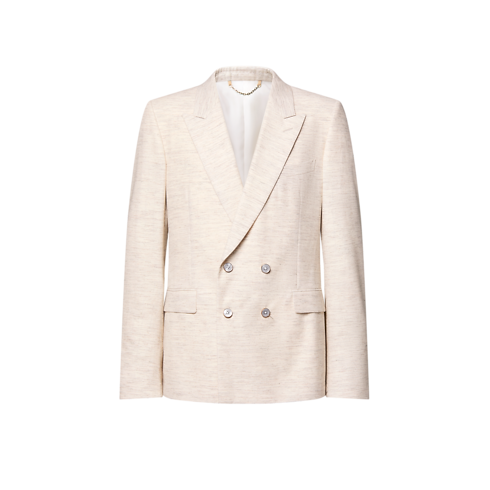 シックなダブルブレストのジャケット。2026春夏ファッションショーに登場した、インドから着想を得た上品な質感と同系色の色合いを表現しました。淡いベージュのウール&コットンをシャープなシルエットに仕上げ、インドの天然染色された糸にインスパイアされた繊細なグレインと斑点状の織りが特徴のアイテム。左袖にはレザーのシグネチャーパッチがアクセントを添えます。揃いのフレアパンツと合わせれば、春を感じさせる端正なスーツスタイルに。