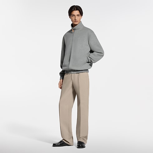 エフォートレスでエレガントなひねりを加えたアイコニックなトラックトップ。淡いヘザーグレーカラーのラグジュアリーなカシミヤとウールのダブルフェイス素材で仕立てました。ファスナー部分のピックステッチや、カシミヤ素材のリブ編みのカフとウエストを彩る同系色のヘリンボーンのラインなど、控えめなディテールがスポーティなシルエットを引き立てます。ファスナー引き手や背面の襟にはメゾンの旅の伝統にオマージュを捧げるヌメ革のタブを配しました。