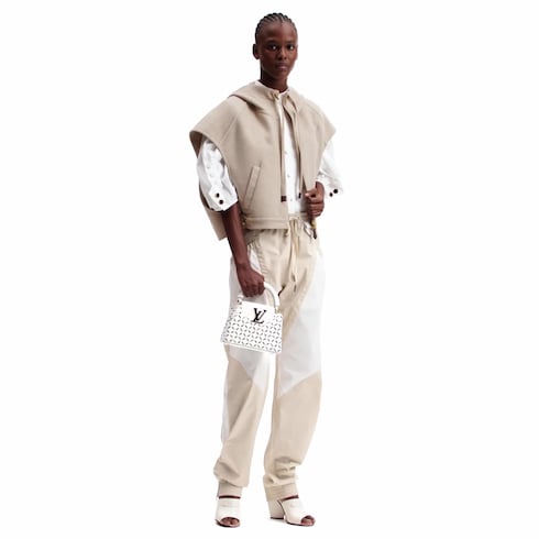 メゾンのモダンな定番アイテムである、オープンアームシルエットのフード付きジャケット。ウールやカシミヤ、シルクの混紡素材を軽量なダブルフェイス加工の技法で仕立て、内側には今シーズンならではの万能な色合いでアイコニックなモノグラム・モチーフをあしらいました。脱構築的なシェイプのフロントにはゴールドカラーのダブルファスナーを配し、両サイドには調整可能なスナップボタンを備えています。