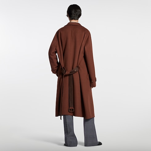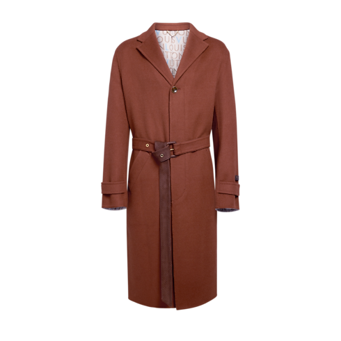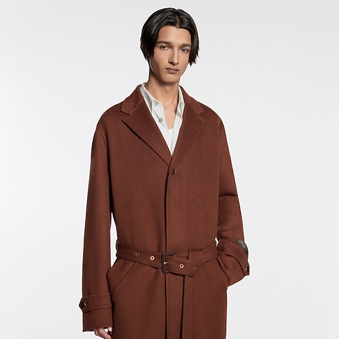 2026春夏ファッションショーに登場した、ウール&シルク混紡素材のベルト付きコート。本コレクションの「インディアン・ダンディ」がまとう、気取らないエレガンスを表現したアイテムです。流れるようなシルエットを描くダブルフェイス素材を使用し、内側にはインドのビルボードから着想を得た、グラフィカルなジャカード織りのLV メイズ・モチーフをあしらいました。左袖のブラウンのレザーパッチには、エンボス加工で「Louis Vuitton Paris」のシグネチャーを施し、シックなアクセントをプラス。