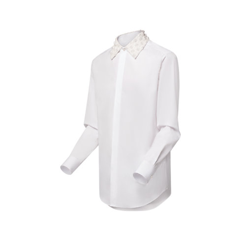 コットンで仕立てたシックなイブニングシャツ。異なるサイズのパール風のビーズを襟の全面に刺繍で施し、トーン・オン・トーンの立体的なダミエ・パターンを想わせる華やかなデザインが特徴です。定番のタキシードシャツから着想を得たエレガントな比翼仕立てのボタンプラケットにはパール風のトップボタンをあしらいました。フォーマルな装いに洗練されたシグネチャーアクセントを添える1着です。