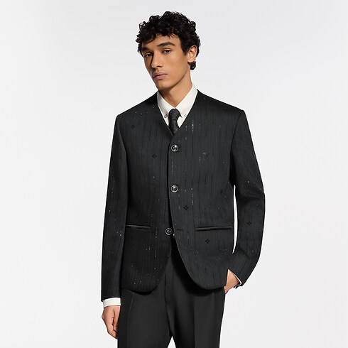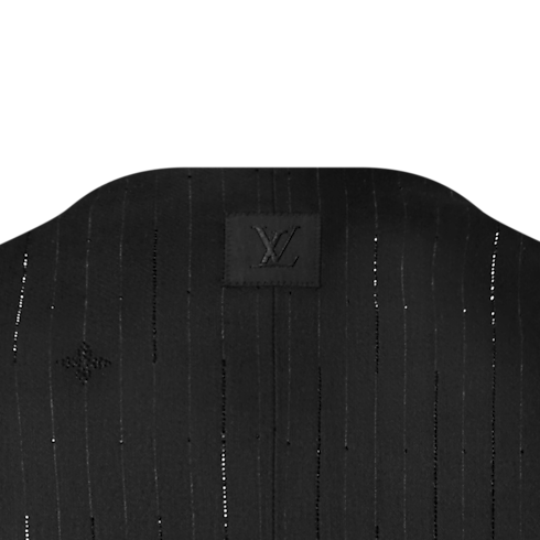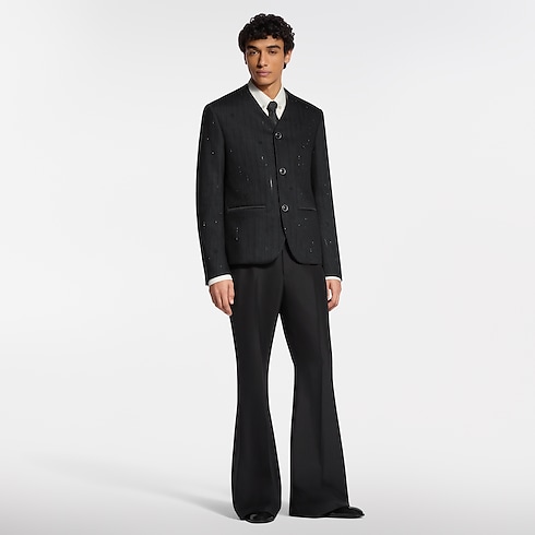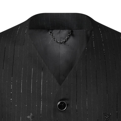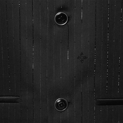 ファレル・ウィリアムスによるアイコニックなノーカラースタイルを取入れた、特徴あるブラックのイブニングジャケット。Vネックとサテンのパイピングポケットを配したミニマルなシルエットに、モノグラム・モチーフを織り交ぜた輝くストラスのピンストライプをあしらいました。「LV」のカフリンクとシグネチャーボタンがジュエリー風のアクセントをプラス。豊富なディテールで彩られた1着が、イブニングスタイルに洗練された印象をもたらします。