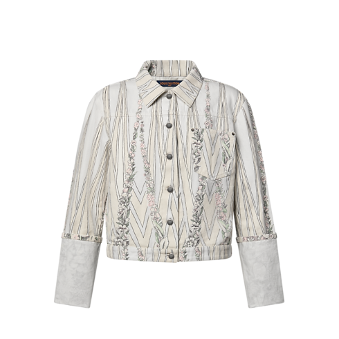 ランウェイに登場した、デニムジャケット。クラシカルな壁紙を想起させるグラフィカル&フローラルのモチーフが描かれた全面プリントが、シックな存在感を放ちます。ボクシーなシルエットに、定番のシャツカラーと胸ポケットを配し、袖口には大ぶりの折り返しカフをあしらうことで、バランスに変化を持たせたデザインに仕上げました。