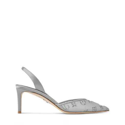 透け感のあるメッシュとスワロフスキー™のストラスが華やかな印象を演出する「ガラ パンプス」。シースルーのメッシュから足元がほんのりと覗き、ルイ・ヴィトンのモノグラム・パターンをストラスがきらびやかに描き出します。ポインテッドトウと細身のミッドヒールがデザインを完成させ、エレガントながらも簡単に履きやすい1足はイブニングシーンに活躍します。