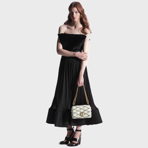 しなやかでラグジュアリーなラムレザーで仕上げた「GO-14 MM」。メゾンの伝統的なトランクのためにデザインされたシグネチャー・パターンをキルティング加工で施しています。トップハンドルとスライドチェーンを備えた多彩な持ち方を楽しめるモデルに、光沢感のあるゴールドカラーのLV ツイストロックでアクセントを効かせました。トップハンドルはチェーンに添えるレザーパッドとしても使用でき、肩掛けや斜め掛けでも快適に持ち運べます。
