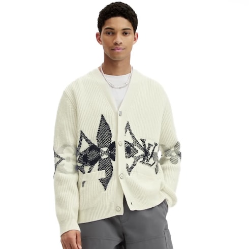 冬のシーズンに最適なウールカーディガン。大ぶりのLVシグネチャーとモノグラム・フラワーを重ね合わせ、雪の結晶を想起させるグラフィカルなモチーフを身頃と袖にあしらいました。ホワイトのボリューム感のあるリブ編みをベースに、グレー&ブルーのコントラストカラーのステッチで表現した洗練されたインターシャニットが、豊かな質感を演出します。ゲレンデでの1日を過ごした後の、心地よいリゾートの夜にぴったりのアイテム。