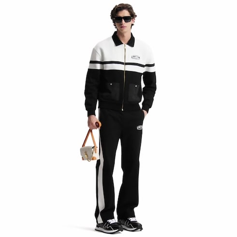 爽やかでスポーティなルックが旅にぴったりのハイブリッドジッパーブルゾン。ブラックのコットンジャージーにコントラストカラーのホワイトのコットンピケのインサートを質感のあるワッフルニットであしらい、「L.Vuitton」の刺繍で胸元をスマートに彩りました。揃いのパンツを合わせれば洗練されたセットアップが完成する、軽量でテクニカルなレイヤーアイテム。