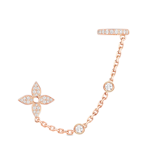 あらゆる装いにトレンディなエッジをプラスする、ピンクゴールドで仕上げた「イヤーカフ イディール ブロッサム ディアモン」。煌めくダイヤモンドをパヴェセッティングしたモノグラム・フラワーのスタッズとイヤークリップを、繊細なチェーンで繋ぎました。チェーンを彩るブリリアントカットの2つのストーンが目を引きます。簡単に着脱でき、同シリーズの他のファインジュエリーとのコーディネートをお楽しみいただけるのも魅力です。