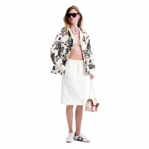 メンズ・ウェアのコードをプレイフルに取入れたスカート。伸縮性のあるウエストラインに2つの小ぶりなボタンとフェイクの比翼を配しました。カジュアルなコットンジャージーでエフォートレスな膝丈シルエットに仕立てた、毎日のスタイリングにぴったりの万能なアイテムです。エンボス加工を施したトーン・オン・トーンのモノグラム・デニムのポケットにはゴールドカラーの「Louis Vuitton」プレートをあしらい、背面にシグネチャータッチをプラス。