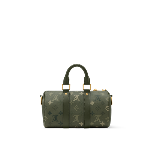 アーミーグリーンの色合いと不規則なモノグラム・プリントが特徴のモノグラム・サープラス キャンバスを使用した、「キーポル・バンドリエール 25」。カモフラージュ風のデザインが魅力のアイテムです。メインコンパートメントは、エイジング加工を施したゴールドカラーのファスナーでしっかりと開閉可能。トップハンドルに加え、取外し可能な幅広のテキスタイルストラップを備え、肩掛けや斜め掛けバッグとしても楽しめます。